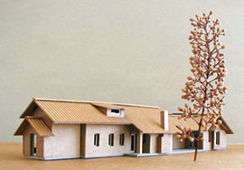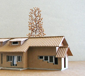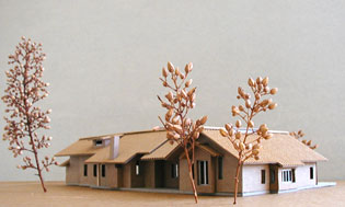 the phasing of the building process. Phase One includes a Great Room, Kitchen, Breakfast Nook, intimate fireplace nook, and spacious Loft Bedroom. Also a 1-1/2 Baths and an extensive Pantry. Phase Two is the addition of a bedroom wing with two bedrooms and an exquisite skylight, bath partitioned with shoji screens and a sunken soaking tub. Connected to Main House with covered breezeway offering summer shade. Phase Three is the conversion of breezeway into an enclosed solarium for winter 'sunspace' and summer 'coolspace', game room, and sitting room living space. |